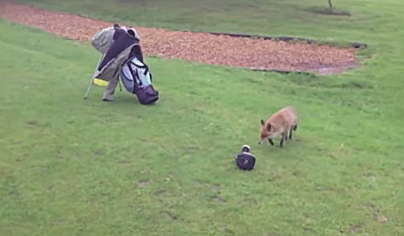 A fox chases a golfer around the course after stealing a holster from him